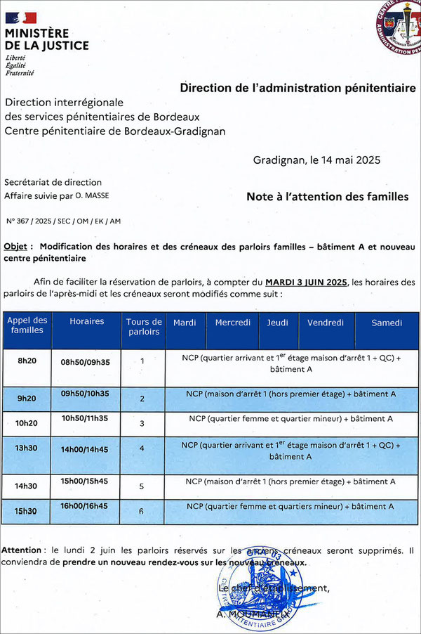 Rappel: il faut se présenter 30 minutes avant l 'heure du parloir